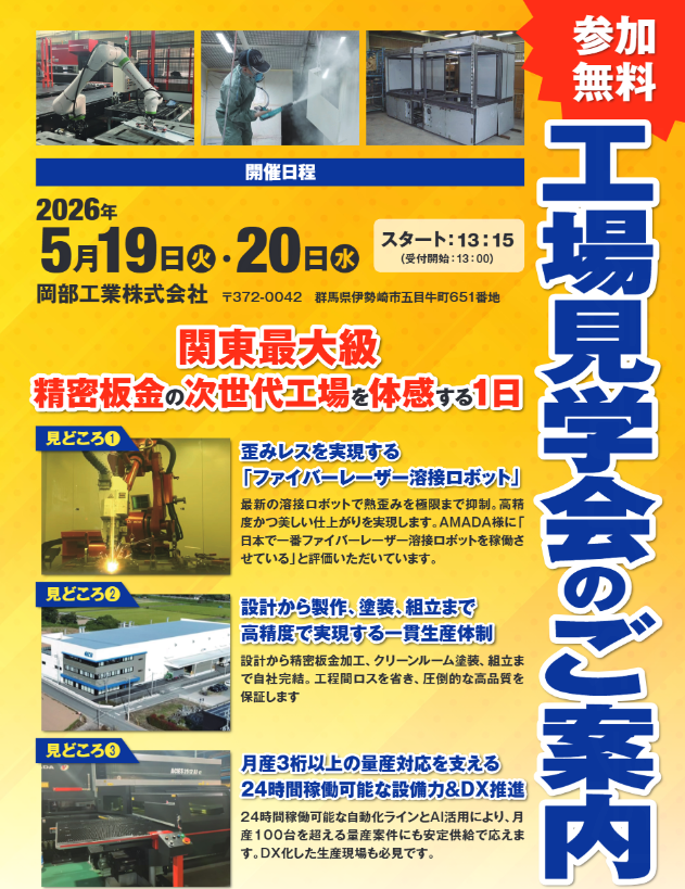 岡部工業株式会社は、2026年5月19日・20日に、「工場見学会」を開催いたします。